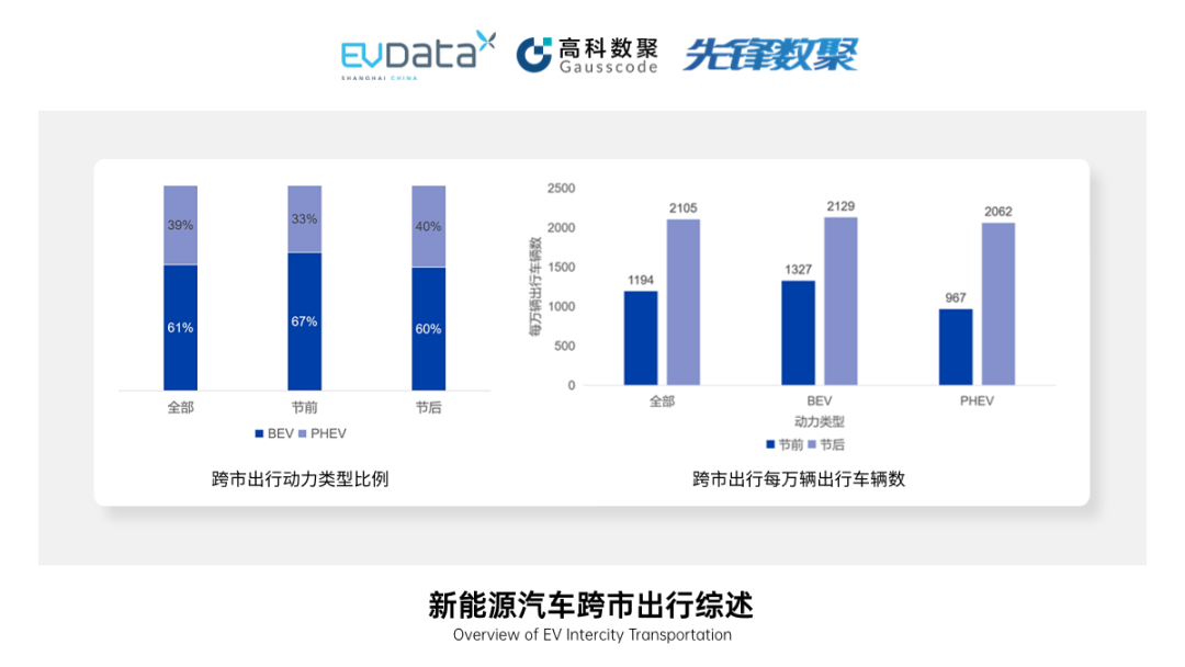[1] 本文随机选取部分样本经过数据清洗后进行分析。并从时间上将观测期分为节前(9月22日-9月28日)和节中(9月29日-10月6日),从场景上分为市区出行和跨市出行,并采用每万辆出行车辆数对出行强度进行刻画。每万辆出行车辆数以观测期内总出行车辆数为基数计算,其中BEV和PHEV的出行强度则分别以观测期内BEV和PHEV的总出行车辆数为基数计算。